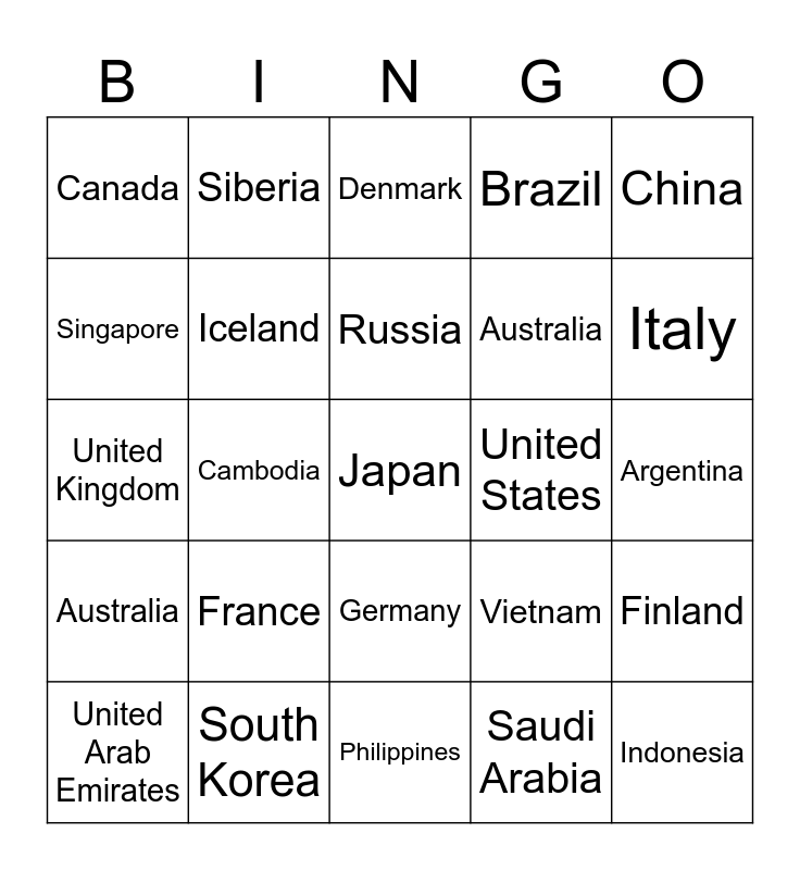 This bingo card has a free space and 24 words: France, South Korea, Russia, United Arab Emirates, China, Canada, Singapore, Siberia, United States, Germany, Australia, United Kingdom, Vietnam, Finland, Iceland, Saudi Arabia, Argentina, Denmark, Italy, Cambodia, Indonesia, Australia, Brazil and Philippines.