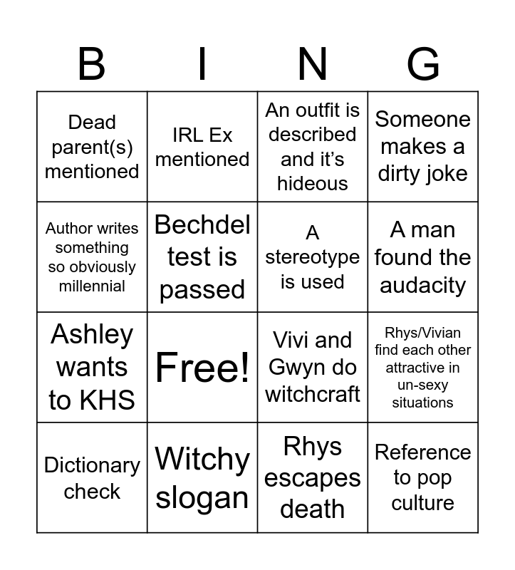 This bingo card has 18 words: Free!, Reference to pop culture, An outfit is described and it’s hideous, Dead parent(s) mentioned, Vivi and Gwyn do witchcraft, Someone makes a dirty joke, Dictionary check, IRL Ex mentioned, A man found the audacity, Ashley wants to KHS, Rhys escapes death, Author writes something so obviously millennial, Rhys/Vivian find each other attractive in un-sexy situations, Bechdel test is passed, A stereotype is used, Unexpected backstreet revealed, Witchy slogan and Cockblocked.