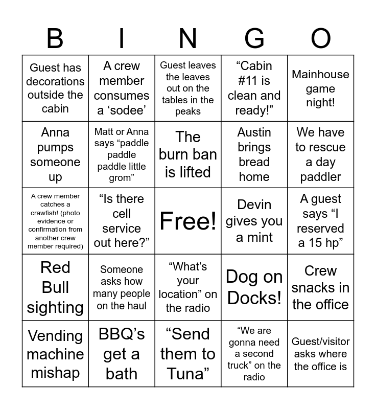 This bingo card has a free space and 49 words: Tie-Dye shirt / hoodie sighting, Guest/visitor asks where the office is, A guest locks themselves out of their cabin, “Send them to Tuna”, Someone asks how many people on the haul, Someone rents a SUP, A crew member consumes a ‘sodee’, Guest has an umbrella, Anna pumps someone up, “Do you sell beer or alcohol?”, Matt or Anna says “paddle paddle paddle little grom”, “Cabin #11 is clean and ready!”, Crew snacks in the office, Dog on Docks!, Someone goes swimming, “What’s the wifi password?”, The burn ban is lifted, Devin gives you a mint, Someone has to swap out a propane tank, Mainhouse game night!, “Is there cell service out here?”, “We are gonna need a second truck” on the radio, Guest has decorations outside the cabin, Austin brings bread home, >5 cabin change over, We have to rescue a day paddler, Vending machine mishap, Candi make fun of Kristina, “What’s your location” on the radio, Red Bull sighting, Someone in the peaks needs a little bit extra attention, Office ladies yell at someone to close a door, cabinet, or drawer, Somebody needs any sort of “rescue”, A crew member wears a name tag, BBQ’s get a bath, MEN saying “yeah, sure, I know” the whole time you are going over map directions/boat tutorial, Crew member goes on a hike for fun, Deer sighting (photo evidence or confirmation from another crew member required), A guest says “I reserved a 15 hp”, A big boat needs a service, Guests need a different sized pan than what they have, “Where can I fill up my water?”, Music is playing in the office, Motor shop table is clean!, A crew member catches a crawfish! (photo evidence or confirmation from another crew member required), Guest leaves the leaves out on the tables in the peaks, Mother Kristina performs a tarot reading and/or horoscope analysis, Lucas, Alec, John, or Austin has to fix something broken in a cabin and A crew member goes paddling.