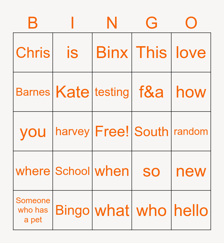 This bingo card has a free space and 29 words: Someone who has a pet, Has previous experience with aviation, harvey, ruth, Chris, Binx, Kate, School, South, Bingo, random, hello, what, who, how, why, when, where, love, you, so, much, f&a, Barnes, This, is, new, testing and ok.