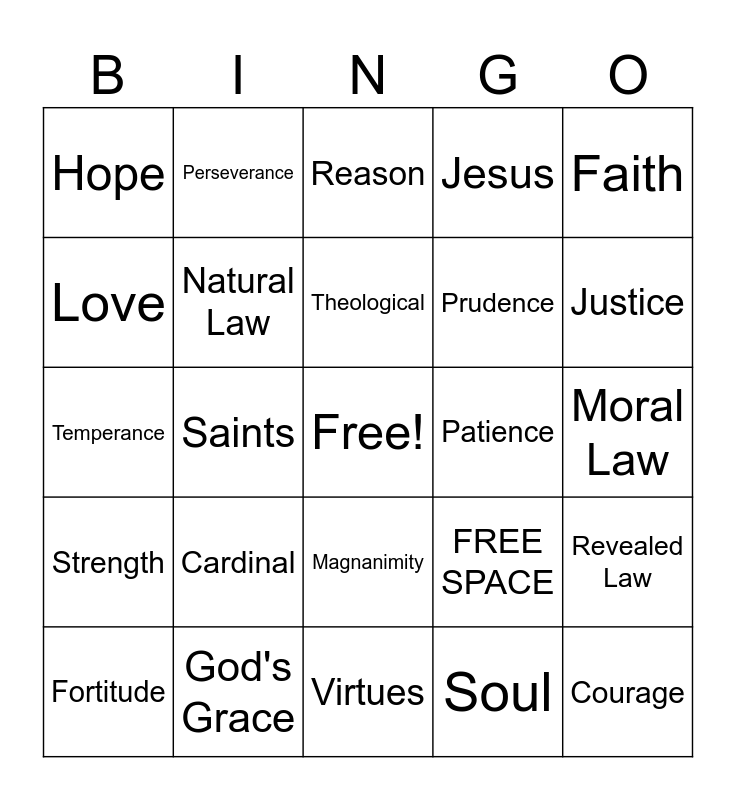 This bingo card has a free space and 25 words: Cardinal, Virtues, Theological, Fortitude, Faith, Hope, Love, Perseverance, Patience, Magnanimity, Prudence, Temperance, FREE SPACE, Revealed Law, Natural Law, Eternal Law, Moral Law, Reason, Justice, Saints, Courage, God's Grace, Strength, Jesus and Soul.