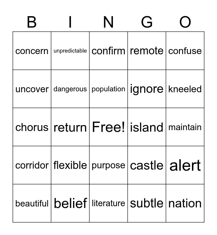 This bingo card has a free space and 70 words: contain, maintain, explain, achieve, belief, receive, remote, include, confuse, rescue, alert, insert, concern, confirm, birthday, return, purpose, ignore, absorb, corridor, island, castle, kneeled, wrestle, knight, honest, receipt, doubt, subtle, debris, unpredictable, rebuild, misplace, disagree, preview, subway, disappear, retell, misprint, uncover, dependable, flexible, nation, tension, precious, dangerous, beautiful, hopeful, careless, plentiful, appreciate, celebrate, dictionary, engineer, literature, magazine, population, temperature, opportunity, electricity, chorus, architect, mechanic, photograph, chorus, chemistry, echo, orchestra, schedule and character.