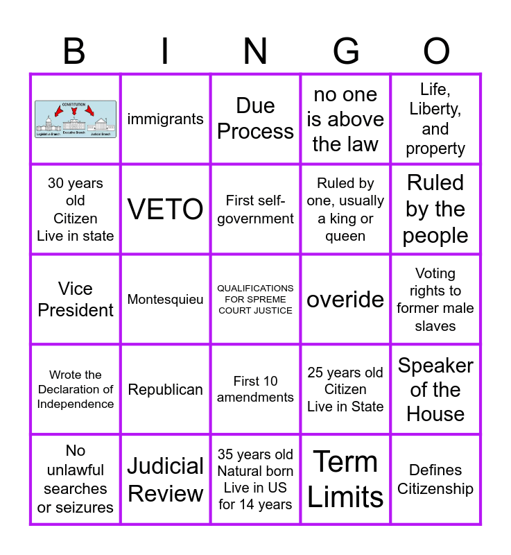 This bingo card has 2 images, a free space and 37 words: To bear arms, RASPP, Commander-in-chief, VETO, No unlawful searches or seizures, First 10 amendments, First self-government, resident alien, Life, Liberty, and property, Wrote the Declaration of Independence, Montesquieu, no one is above the law, Defines Citizenship, Voting rights to former male slaves, overide, Republican, State of the Union address, 25 years old Citizen Live in State, 30 years old Citizen Live in state, 35 years old Natural born Live in US for 14 years, Ruled by one, usually a king or queen, Ruled by the people, 13th Amendment 14th Amendment 15th Amendment, Duties of Citizens, responsibilities of citizens, Ancient Rome, The declaration of independance, immigrants, Common sense, George Washington, Due Process, Judicial Review, Term Limits, Checks and Balances, Speaker of the House, Vice President and Congress.