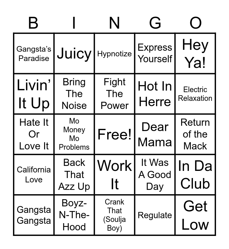 This bingo card has a free space and 27 words: It Was A Good Day, Gin and Juice, Hot In Herre, Crank That (Soulja Boy), Livin’ It Up, Hypnotize, Juicy, California Love, Dear Mama, In Da Club, Hate It Or Love It, Express Yourself, Gangsta Gangsta, Boyz-N-The-Hood, Electric Relaxation, Walk This Way (feat. Aerosmith), Bring The Noise, Fight The Power, Back That Azz Up, Gangsta’s Paradise, Return of the Mack, Regulate, Mo Money Mo Problems, Get Low, Work It, Hey Ya! and Ms. Jackson.