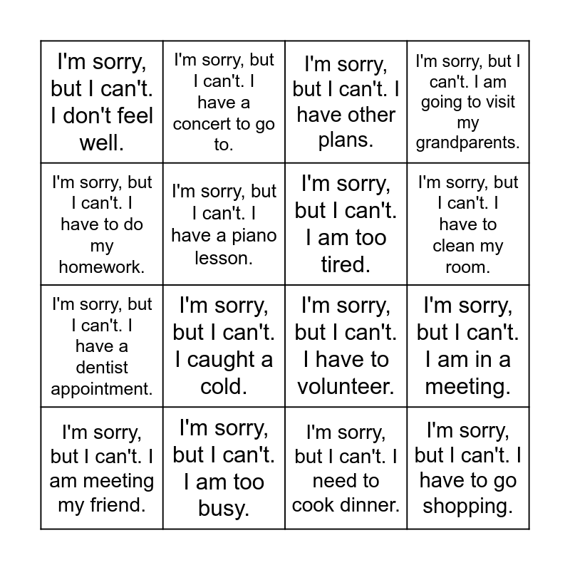 This bingo card has 16 words: I'm sorry, but I can't. I am too busy., I'm sorry, but I can't. I am in a meeting., I'm sorry, but I can't. I have other plans., I'm sorry, but I can't. I don't feel well., I'm sorry, but I can't. I have a dentist appointment., I'm sorry, but I can't. I have a concert to go to., I'm sorry, but I can't. I have to volunteer., I'm sorry, but I can't. I need to cook dinner., I'm sorry, but I can't. I have to do my homework., I'm sorry, but I can't. I have a piano lesson., I'm sorry, but I can't. I am meeting my friend., I'm sorry, but I can't. I am going to visit my grandparents., I'm sorry, but I can't. I caught a cold., I'm sorry, but I can't. I have to clean my room., I'm sorry, but I can't. I am too tired. and I'm sorry, but I can't. I have to go shopping..