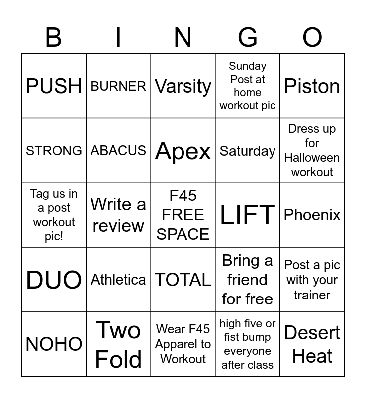 This bingo card has a free space and 24 words: Athletica, Two Fold, Apex, NOHO, Piston, PUSH, STRONG, BURNER, LIFT, TOTAL, Saturday, Tag us in a post workout pic!, Bring a friend for free, Post a pic with your trainer, ABACUS, high five or fist bump everyone after class, Phoenix, Varsity, Dress up for Halloween workout, Write a review, Desert Heat, DUO, Sunday Post at home workout pic and Wear F45 Apparel to Workout.