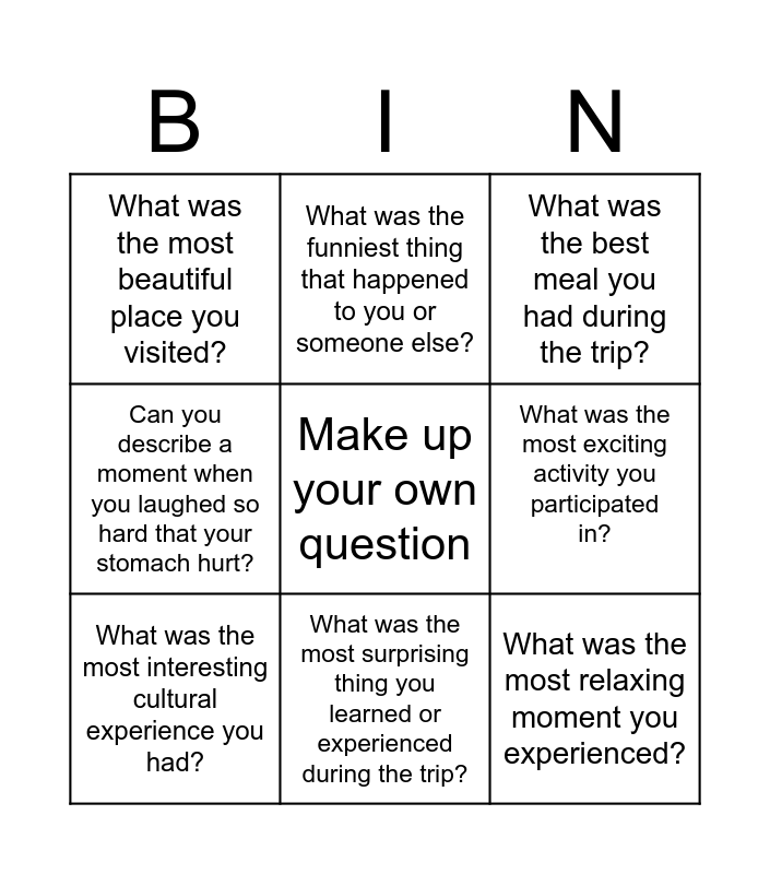 This bingo card has a free space and 8 words: What was the most exciting activity you participated in?, What was the best meal you had during the trip?, What was the funniest thing that happened to you or someone else?, What was the most interesting cultural experience you had?, What was the most beautiful place you visited?, What was the most relaxing moment you experienced?, Can you describe a moment when you laughed so hard that your stomach hurt? and What was the most surprising thing you learned or experienced during the trip?.