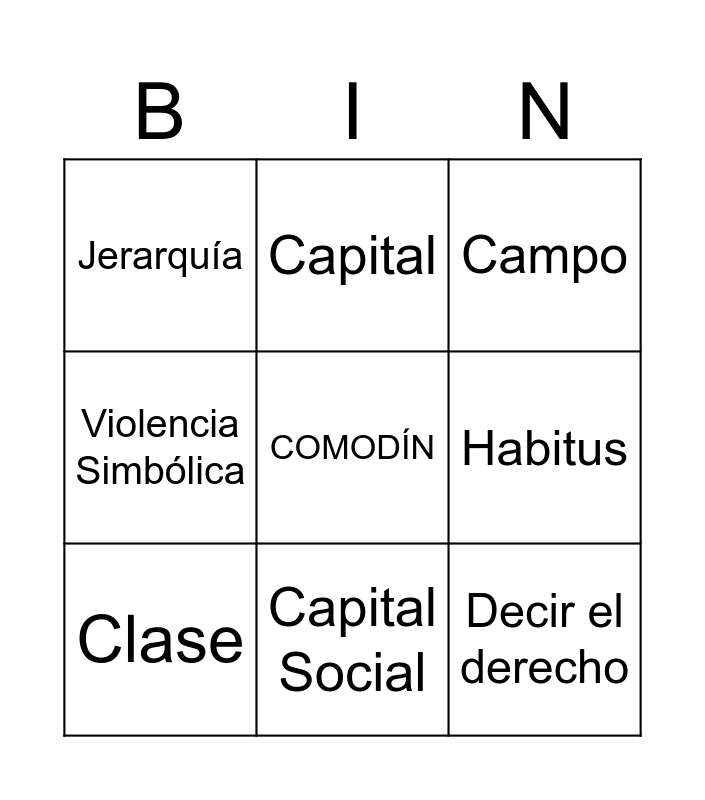 This bingo card has a free space and 8 words: Habitus, Campo, Capital, Clase, Jerarquía, Decir el derecho, Violencia Simbólica and Capital Social.