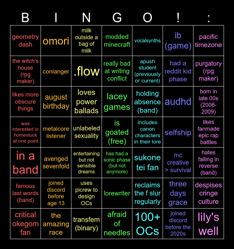 This bingo card has a free space and 48 words: in a band, metalcore listener, transfem (binary), has had a sonic phase (but not anymore), apush student (previously or current), selfship, pacific timezone, critical okegom fan, august birthday, unlabeled sexuality, modded minecraft, vocalsynths, audhd, born in late 00s (2006-2009), was interested in homestuck at one point, joined discord before age 13, milk outside a bag of milk, lacey games, reclaims the f slur regularly, ib (game), purgatory (rpg maker), the witch's house (rpg maker), omori, .flow, 100+ OCs, had a reddit kid phase, likes fanmade epic rap battles, famous last words (band), avenged sevenfold, loves power ballads, lorewriter, holding absence (band), three days grace, despises cringe culture, geometry dash, the amazing race, entertaining but not sensible dreams, afraid of needles, includes canon characters in their lore, joined discord before the 2020s, hates falling in reverse (band), likes more obscure things, conlanger, uses picrew to design OCs, really bad at writing conflict, sukone tei fan, mc creative > survival and lily's well.