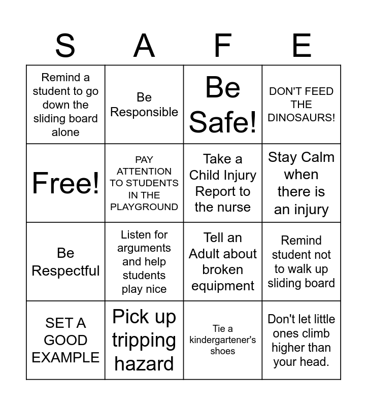 This bingo card has 16 words: Pick up tripping hazard, Remind student not to walk up sliding board, Be Safe!, Remind a student to go down the sliding board alone, Be Respectful, Be Responsible, Tell an Adult about broken equipment, Tie a kindergartener's shoes, Free!, PAY ATTENTION TO STUDENTS IN THE PLAYGROUND, SET A GOOD EXAMPLE, DON'T FEED THE DINOSAURS!, Listen for arguments and help students play nice, Stay Calm when there is an injury, Take a Child Injury Report to the nurse and Don't let little ones climb higher than your head..