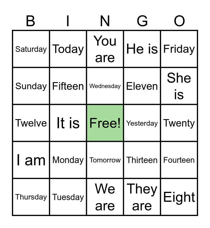 This bingo card has a free space and 24 words: Monday, Tuesday, Wednesday, Thursday, Friday, Saturday, Sunday, Today, Yesterday, Tomorrow, Eleven, Twelve, Thirteen, Fourteen, Fifteen, They are, Twenty, You are, She is, It is, Eight, I am, He is and We are.