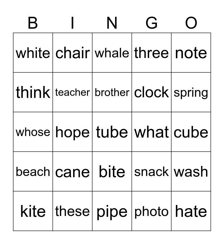 This bingo card has a free space and 24 words: cane, these, brother, kite, note, white, think, chair, what, bite, clock, whose, snack, wash, teacher, photo, cube, whale, spring, hope, hate, beach, three and pipe.
