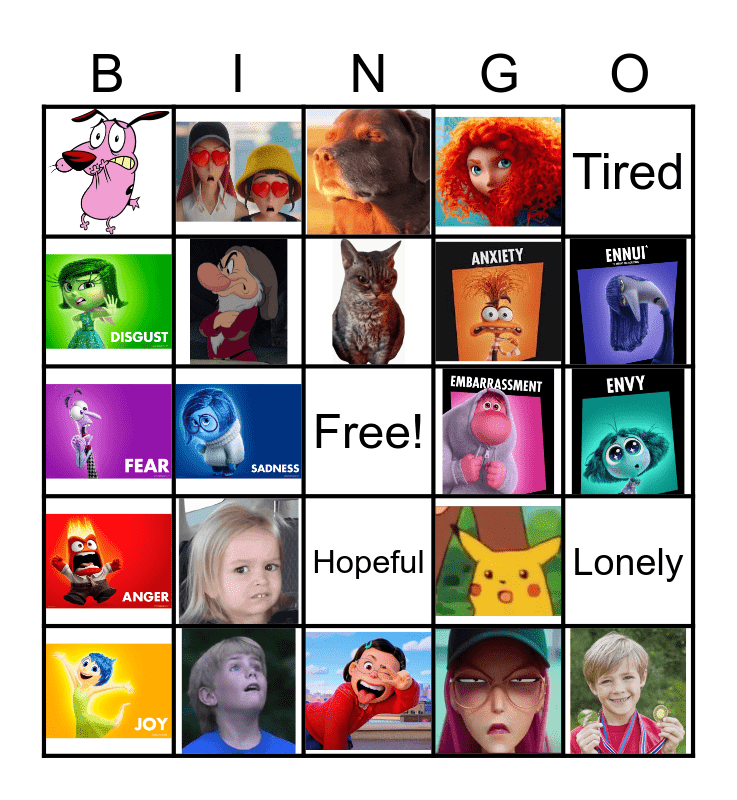 This bingo card has 21 images, a free space and 3 words: Tired, Hopeful and Lonely.