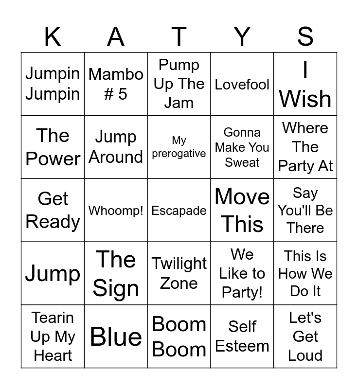 This bingo card has 38 words: Freedom!, Shoop, Good Vibrations, Jump Around, This Is How We Do It, The Sign, My prerogative, Free Your Mind, I Wish, Gonna Make You Sweat, Whoomp!, Lovefool, Escapade, Say You'll Be There, The Power, Jump, Baby Got Back, Pump Up The Jam, The Rhythm Of The Night, Move This, Jumpin Jumpin, Blue, Where The Party At, Tearin Up My Heart, Where Do U Do, Boom Boom, Let's Get Loud, Vogue, This is YOUR Night, Wild Thang, Everybody, Twilight Zone, Self Esteem, Mambo # 5, It's My Life, We Like to Party!, Get Ready and Sandstorm.