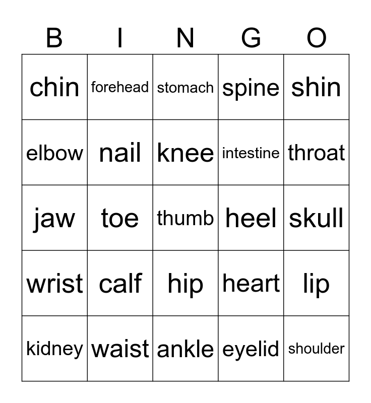 This bingo card has 25 words: calf, ankle, knee, kidney, shin, chin, elbow, forehead, heel, hip, intestine, jaw, heart, lip, nail, shoulder, skull, stomach, throat, toe, thumb, waist, wrist, spine and eyelid.