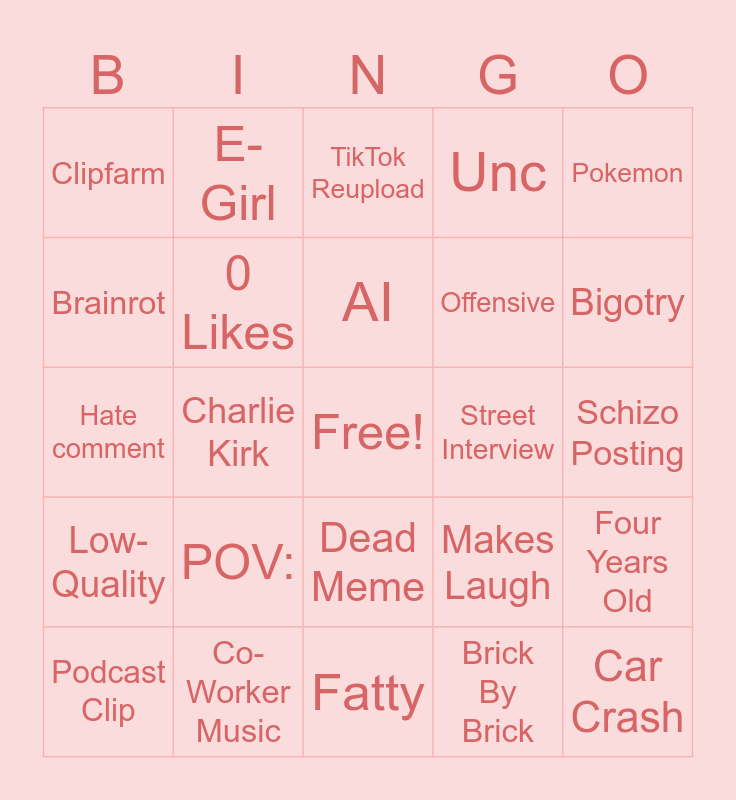 This bingo card has a free space and 24 words: POV:, Co-Worker Music, AI, Podcast Clip, Pokemon, Clipfarm, Brainrot, E-Girl, Street Interview, Dead Meme, Offensive, Hate comment, Makes Laugh, Four Years Old, 0 Likes, Brick By Brick, Schizo Posting, TikTok Reupload, Bigotry, Charlie Kirk, Car Crash, Low-Quality, Unc and Fatty.