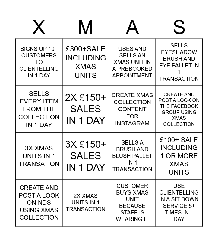 This bingo card has 16 words: 2X XMAS UNITS IN 1 TRANSACTION, £100+ SALE INCLUDING 1 OR MORE XMAS UNITS, USES AND SELLS AN XMAS UNIT IN A PREBOOKED APPOINTMENT, SIGNS UP 10+ CUSTOMERS TO CLIENTELLING IN 1 DAY, 3X XMAS UNITS IN 1 TRANSATION, £300+SALE INCLUDING XMAS UNITS, SELLS A BRUSH AND BLUSH PALLET IN 1 TRANSACTION, CUSTOMER BUYS XMAS UNIT BECAUSE STAFF IS WEARING IT, SELLS EVERY ITEM FROM THE COLLECTION IN 1 DAY, 2X £150+ SALES IN 1 DAY, CREATE AND POST A LOOK ON NDS USING XMAS COLLECTION, SELLS EYESHADOW BRUSH AND EYE PALLET IN 1 TRANSACTION, 3X £150+ SALES IN 1 DAY, CREATE AND POST A LOOK ON THE FACEBOOK GROUP USING XMAS COLLECTION, CREATE XMAS COLLECTION CONTENT FOR INSTAGRAM and USE CLIENTELLING IN A SIT DOWN SERVICE 5+ TIMES IN 1 DAY.