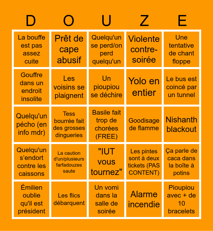 This bingo card has a free space and 24 words: La caution d'un/plusieurs farfadouzes saute, Les flics débarquent, Un pioupiou se déchire, Émilien oublie qu'il est président, Une tentative de chant floppe, La bouffe est pas assez cuite, Gouffre dans un endroit insolite, Prêt de cape abusif, Goodisage de flamme, "IUT vous tournez", Yolo en entier, Quelqu'un pécho (en info mdr), Les pintes sont à deux tickets (PAS CONTENT), Ça parle de caca dans la boîte à potins, Les voisins se plaignent, Alarme incendie, Nishanth blackout, Quelqu'un se perd/on perd quelqu'un, Le bus est coincé par un tunnel, Tess bourrée fait des grosses dingueries, Pioupiou avec + de 10 bracelets, Quelqu'un s’endort contre les caissons, Violente contre-soirée and Un vomi dans la salle de soirée.