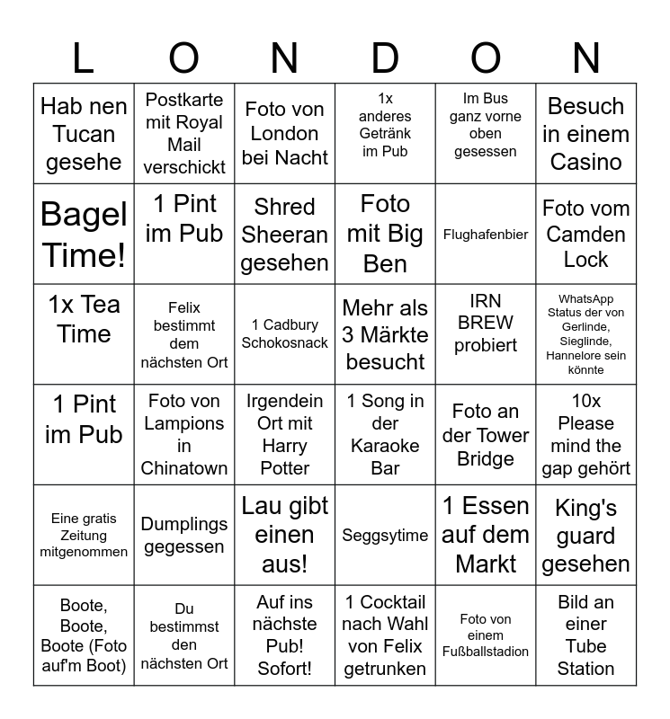 This bingo card has 36 words: 1 Pint im Pub, Foto von Lampions in Chinatown, Auf ins nächste Pub! Sofort!, Foto mit Big Ben, IRN BREW probiert, WhatsApp Status der von Gerlinde, Sieglinde, Hannelore sein könnte, Hab nen Tucan gesehe, Du bestimmst den nächsten Ort, Foto von London bei Nacht, Seggsytime, Flughafenbier, Besuch in einem Casino, Eine gratis Zeitung mitgenommen, Felix bestimmt dem nächsten Ort, Shred Sheeran gesehen, 1x anderes Getränk im Pub, 1 Essen auf dem Markt, 10x Please mind the gap gehört, Bagel Time!, 1 Pint im Pub, Irgendein Ort mit Harry Potter, 1 Song in der Karaoke Bar, Foto an der Tower Bridge, King's guard gesehen, 1x Tea Time, Postkarte mit Royal Mail verschickt, 1 Cadbury Schokosnack, 1 Cocktail nach Wahl von Felix getrunken, Im Bus ganz vorne oben gesessen, Foto vom Camden Lock, Boote, Boote, Boote (Foto auf'm Boot), Dumplings gegessen, Lau gibt einen aus!, Mehr als 3 Märkte besucht, Foto von einem Fußballstadion and Bild an einer Tube Station.