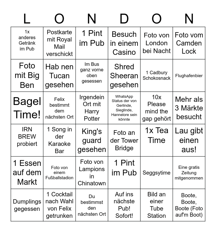 This bingo card has 36 words: 1 Pint im Pub, Foto von Lampions in Chinatown, Auf ins nächste Pub! Sofort!, Foto mit Big Ben, IRN BREW probiert, WhatsApp Status der von Gerlinde, Sieglinde, Hannelore sein könnte, Hab nen Tucan gesehen, Du bestimmst den nächsten Ort, Foto von London bei Nacht, Seggsytime, Flughafenbier, Besuch in einem Casino, Eine gratis Zeitung mitgenommen, Felix bestimmt dem nächsten Ort, Shred Sheeran gesehen, 1x anderes Getränk im Pub, 1 Essen auf dem Markt, 10x Please mind the gap gehört, Bagel Time!, 1 Pint im Pub, Irgendein Ort mit Harry Potter, 1 Song in der Karaoke Bar, Foto an der Tower Bridge, King's guard gesehen, 1x Tea Time, Postkarte mit Royal Mail verschickt, 1 Cadbury Schokosnack, 1 Cocktail nach Wahl von Felix getrunken, Im Bus ganz vorne oben gesessen, Foto vom Camden Lock, Boote, Boote, Boote (Foto auf'm Boot), Dumplings gegessen, Lau gibt einen aus!, Mehr als 3 Märkte besucht, Foto von einem Fußballstadion and Bild an einer Tube Station.