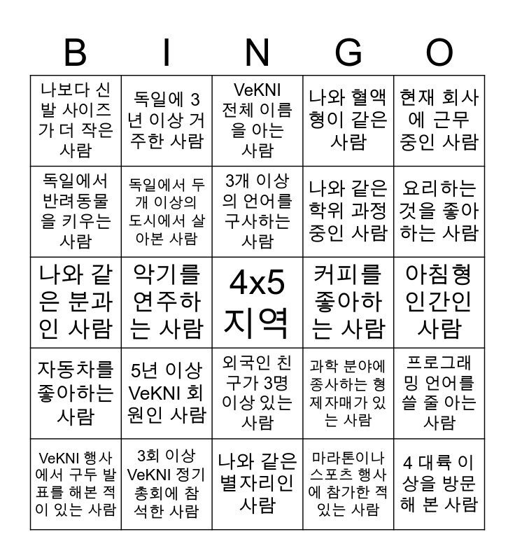 This bingo card has a free space and 24 words: 5년 이상 VeKNI 회원인 사람, 3회 이상 VeKNI 정기총회에 참석한 사람, 3개 이상의 언어를 구사하는 사람, VeKNI 행사에서 구두 발표를 해본 적이 있는 사람, 현재 회사에 근무 중인 사람, 나보다 신발 사이즈가 더 작은 사람, 독일에서 반려동물을 키우는 사람, 독일에 3년 이상 거주한 사람, 커피를 좋아하는 사람, 외국인 친구가 3명 이상 있는 사람, 나와 같은 학위 과정 중인 사람, 나와 같은 분과인 사람, 과학 분야에 종사하는 형제자매가 있는 사람, 프로그래밍 언어를 쓸 줄 아는 사람, 독일에서 두 개 이상의 도시에서 살아본 사람, 마라톤이나 스포츠 행사에 참가한 적 있는 사람, 아침형 인간인 사람, VeKNI 전체 이름을 아는 사람, 요리하는 것을 좋아하는 사람, 악기를 연주하는 사람, 4 대륙 이상을 방문해 본 사람, 자동차를 좋아하는 사람, 나와 혈액형이 같은 사람 and 나와 같은 별자리인 사람.