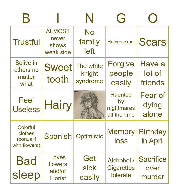 This bingo card has a free space and 24 words: Spanish, Loves flowers and/or Florist, The white knight syndrome, Bad sleep, Scars, Trustful, Belive in others no matter what, ALMOST never shows weak side, Haunted by nightmares all the time, Optimistic, Forgive people easily, Feel Useless, Memory loss, Birthday in April, Sweet tooth, Alchohol / Cigarettes tolerate, Fear of dying alone, No family left, Have a lot of friends, Hairy, Sacrifice over murder, Colorful clothes (bonus if with flowers), Heterosexual and Get sick easily.