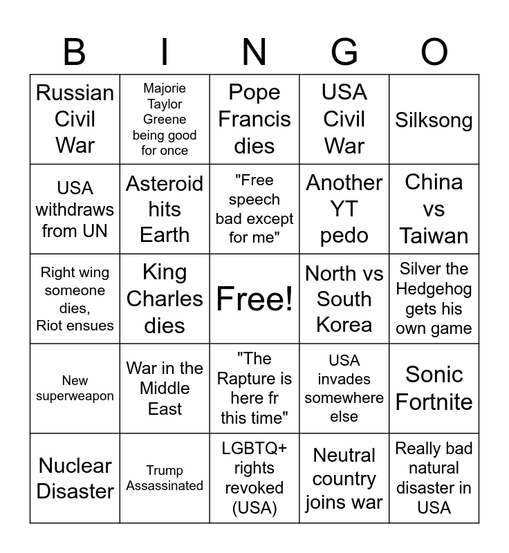 This bingo card has a free space and 24 words: War in the Middle East, Trump Assassinated, "Free speech bad except for me", Nuclear Disaster, Silksong, Russian Civil War, USA withdraws from UN, Majorie Taylor Greene being good for once, North vs South Korea, "The Rapture is here fr this time", Another YT pedo, Right wing someone dies, Riot ensues, USA invades somewhere else, Sonic Fortnite, Asteroid hits Earth, Neutral country joins war, Silver the Hedgehog gets his own game, Pope Francis dies, China vs Taiwan, King Charles dies, Really bad natural disaster in USA, New superweapon, USA Civil War and LGBTQ+ rights revoked (USA).