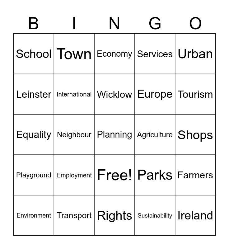 This bingo card has 43 words: Development, Planning, community, Environment, Housing, Sustainability, Economy, Rural, Urban, Transport, Services, Agriculture, Free!, Employment, Education, Rights, Responsibilities, Equality, Population, Tourism, Town, City, Villiage, School, Hospital, Shops, Houses, Apartments, Parks, Playground, Money, Farmers, Crops, Neighbour, Energy, Buildings, Ireland, Wicklow, Leinster, Europe, Local, International and Global.
