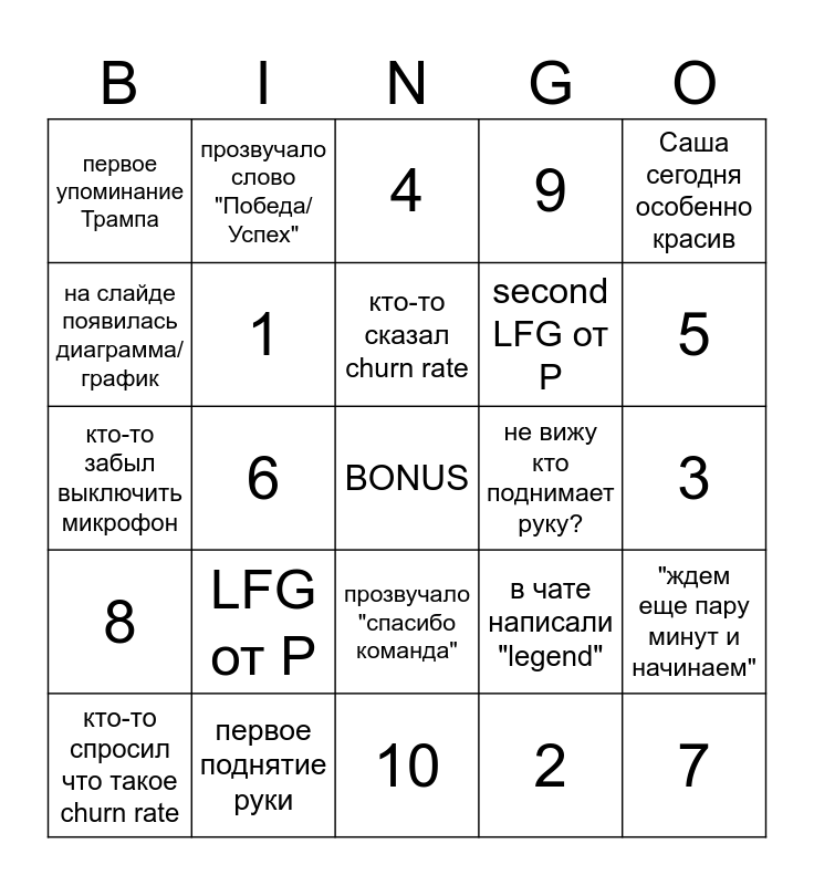 This bingo card has a free space and 24 words: LFG от P, первое поднятие руки, кто-то сказал churn rate, кто-то спросил что такое churn rate, Саша сегодня особенно красив, первое упоминание Трампа, на слайде появилась диаграмма/график, прозвучало слово "Победа/Успех", не вижу кто поднимает руку?, прозвучало "спасибо команда", second LFG от P, кто-то забыл выключить микрофон, в чате написали "legend", "ждем еще пару минут и начинаем", 1, 2, 3, 4, 5, 6, 7, 8, 9 and 10.
