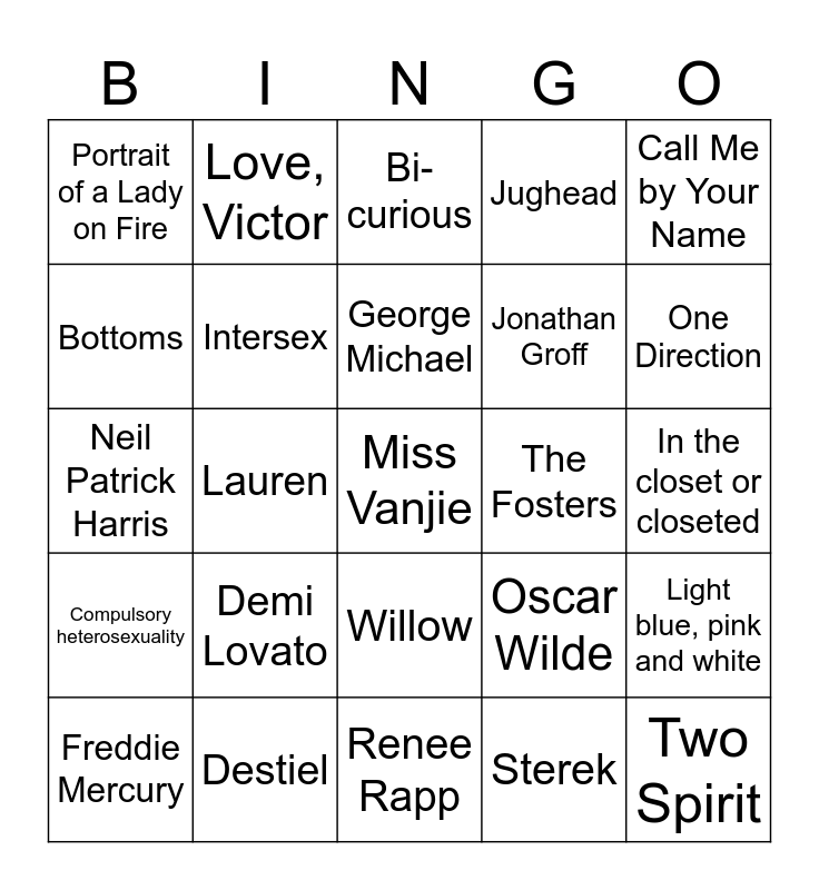This bingo card has 25 words: Demi Lovato, Renee Rapp, George Michael, Freddie Mercury, Call Me by Your Name, Portrait of a Lady on Fire, Bottoms, Love, Victor, The Fosters, Willow, Jonathan Groff, Neil Patrick Harris, Oscar Wilde, Light blue, pink and white, Intersex, Two Spirit, In the closet or closeted, Bi-curious, One Direction, Lauren, Miss Vanjie, Destiel, Compulsory heterosexuality, Jughead and Sterek.