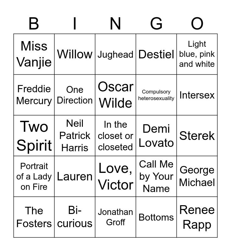 This bingo card has 25 words: Lauren, Jonathan Groff, Oscar Wilde, The Fosters, Light blue, pink and white, Miss Vanjie, Freddie Mercury, Willow, Demi Lovato, Love, Victor, Compulsory heterosexuality, Two Spirit, Call Me by Your Name, George Michael, One Direction, Renee Rapp, Sterek, Jughead, Intersex, Neil Patrick Harris, In the closet or closeted, Bi-curious, Portrait of a Lady on Fire, Destiel and Bottoms.
