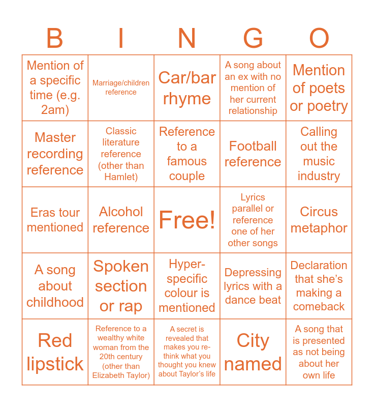 This bingo card has a free space and 24 words: Spoken section or rap, Reference to a wealthy white woman from the 20th century (other than Elizabeth Taylor), Reference to a famous couple, Red lipstick, Mention of poets or poetry, Mention of a specific time (e.g. 2am), Master recording reference, Marriage/children reference, Lyrics parallel or reference one of her other songs, Hyper-specific colour is mentioned, Football reference, Eras tour mentioned, Depressing lyrics with a dance beat, Declaration that she’s making a comeback, Classic literature reference (other than Hamlet), City named, Circus metaphor, Car/bar rhyme, Calling out the music industry, Alcohol reference, A song that is presented as not being about her own life, A song about childhood, A song about an ex with no mention of her current relationship and A secret is revealed that makes you re-think what you thought you knew about Taylor’s life.