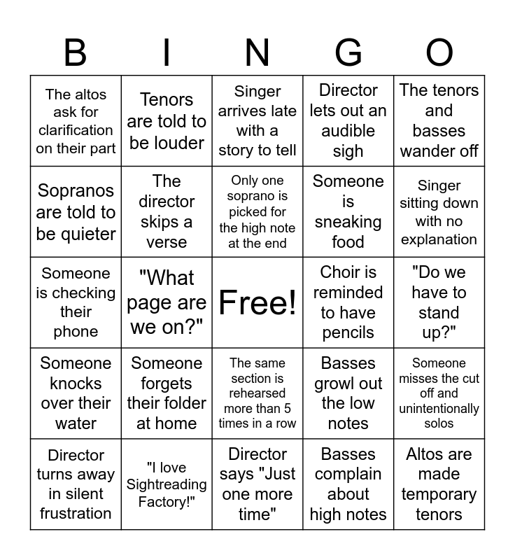 This bingo card has a free space and 24 words: Someone forgets their folder at home, "I love Sightreading Factory!", Only one soprano is picked for the high note at the end, Director turns away in silent frustration, The tenors and basses wander off, The altos ask for clarification on their part, Sopranos are told to be quieter, Tenors are told to be louder, Choir is reminded to have pencils, The same section is rehearsed more than 5 times in a row, Someone is sneaking food, Someone is checking their phone, Basses growl out the low notes, Someone misses the cut off and unintentionally solos, The director skips a verse, Basses complain about high notes, "Do we have to stand up?", Singer arrives late with a story to tell, Singer sitting down with no explanation, "What page are we on?", Altos are made temporary tenors, Someone knocks over their water, Director lets out an audible sigh and Director says "Just one more time".
