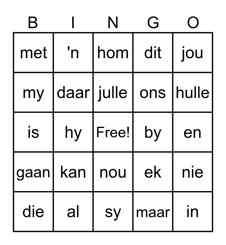 This bingo card has a free space and 29 words: die, van, hy, dat, met, hom, daar, kan, by, al, en, in, sy, maar, hulle, dis, nou, gaan, jou, is, ek, wat, ons, my, dit, 'n, nie, julle and jy.