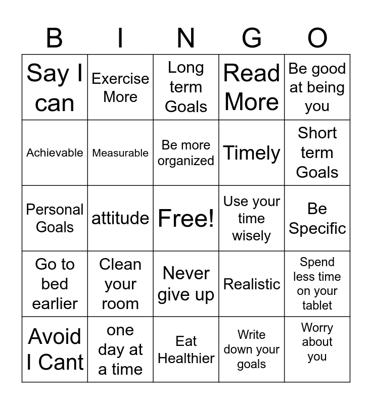 This bingo card has a free space and 29 words: Avoid I Cant, Challenge yourself, attitude, Avoid Gossiping, Say I can, Long term Goals, Measurable, Clean your room, Use your time wisely, one day at a time, Be Specific, Worry about you, Eat Healthier, Write down your goals, Short term Goals, Track your progress, Never give up, Go to bed earlier, Be good at being you, Personal Goals, Realistic, Success, Timely, Achievable, Read More, Exercise More, Spend less time on your tablet, Be more organized and Be kind.