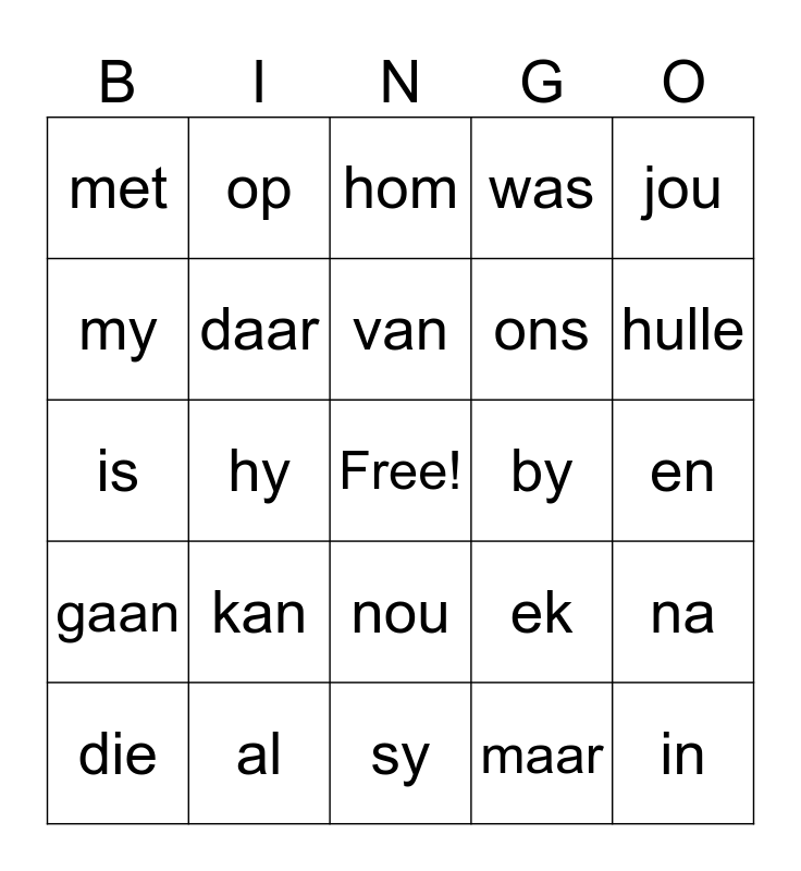 This bingo card has a free space and 29 words: die, van, hy, dat, met, hom, daar, kan, by, al, en, in, sy, maar, hulle, dis, nou, gaan, jou, is, ek, wat, ons, my, was, op, na, van and af.