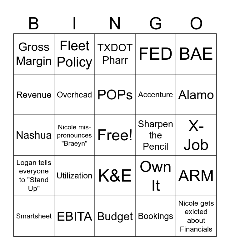 This bingo card has a free space and 24 words: Utilization, EBITA, POPs, Smartsheet, BAE, Gross Margin, Revenue, Fleet Policy, Sharpen the Pencil, K&E, Accenture, Nashua, Own It, ARM, Overhead, Bookings, X-Job, TXDOT Pharr, Alamo, Nicole mis-pronounces "Braeyn", Nicole gets exicted about Financials, Logan tells everyone to "Stand Up", FED and Budget.