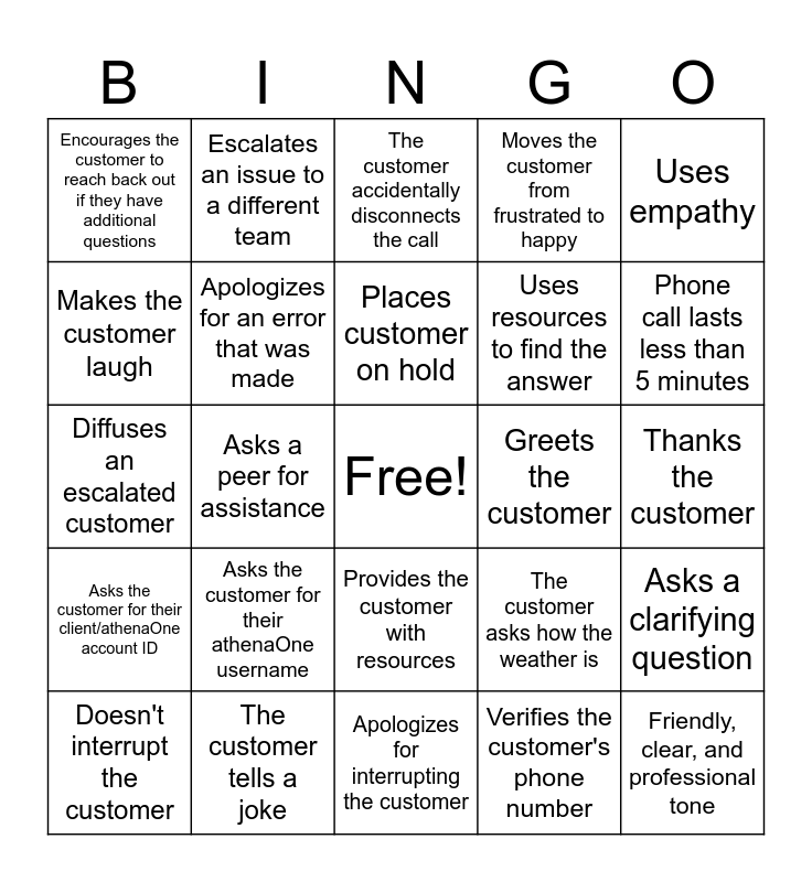 This bingo card has a free space and 24 words: Asks the customer for their athenaOne username, The customer tells a joke, Places customer on hold, Doesn't interrupt the customer, Uses empathy, Encourages the customer to reach back out if they have additional questions, Makes the customer laugh, Escalates an issue to a different team, Greets the customer, Provides the customer with resources, Uses resources to find the answer, Diffuses an escalated customer, The customer asks how the weather is, Asks a clarifying question, Apologizes for an error that was made, Verifies the customer's phone number, Thanks the customer, The customer accidentally disconnects the call, Phone call lasts less than 5 minutes, Asks a peer for assistance, Friendly, clear, and professional tone, Asks the customer for their client/athenaOne account ID, Moves the customer from frustrated to happy and Apologizes for interrupting the customer.
