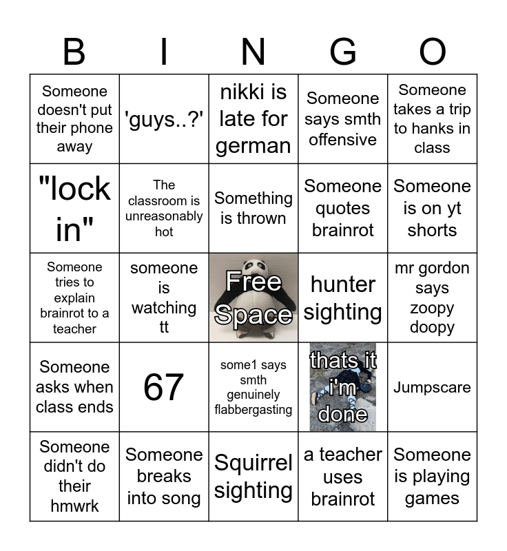 This bingo card has 1 images, a free space and 24 words: 67, Someone breaks into song, Something is thrown, Someone didn't do their hmwrk, Someone takes a trip to hanks in class, Someone doesn't put their phone away, "lock in", 'guys..?', hunter sighting, some1 says smth genuinely flabbergasting, Someone quotes brainrot, Someone tries to explain brainrot to a teacher, thats it i'm done, Jumpscare, The classroom is unreasonably hot, a teacher uses brainrot, mr gordon says zoopy doopy, nikki is late for german, Someone is on yt shorts, someone is watching tt, Someone is playing games, Someone asks when class ends, Someone says smth offensive and Squirrel sighting.