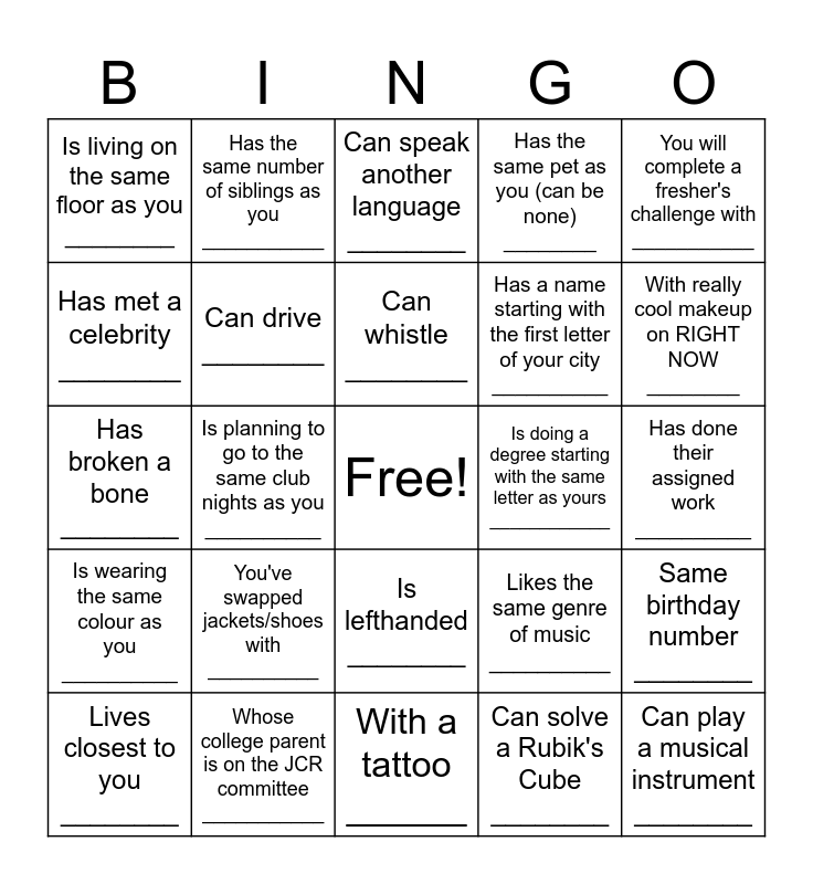 This bingo card has a free space and 28 words: Same birthday number ________, Lives in a city starting with the first letter of your name ___________, Has a name starting with the first letter of your city __________, Can solve a Rubik's Cube ________, Has met a celebrity ________, Can speak another language ________, Has the same number of siblings as you ___________, Is wearing the same colour as you __________, Is doing a degree starting with the same letter as yours ____________, Lives closest to you ________, Has broken a bone ________, Has the same pet as you (can be none) ________, Whose college parent is on the JCR committee ___________, With a tattoo ______, With really cool makeup on RIGHT NOW ________, Taller than 6' or shorter than 5' ________, You've swapped jackets/shoes with __________, Can drive ________, Can whistle ________, Is lefthanded ________, Is living on the same floor as you ________, Is vegan ________, Can play a musical instrument ________, Is planning to go to the same club nights as you __________, Has done their assigned work __________, Likes the same genre of music __________, You will complete a fresher's challenge with ___________ and Has the same favourite drink as you __________.