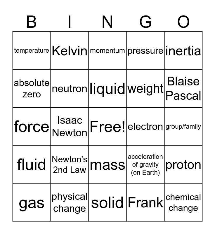 This bingo card has a free space and 25 words: Newton's 2nd Law, solid, liquid, gas, inertia, temperature, absolute zero, Kelvin, electron, mass, weight, force, acceleration of gravity (on Earth), proton, neutron, period, group/family, momentum, Blaise Pascal, Isaac Newton, chemical change, physical change, fluid, pressure and Frank.