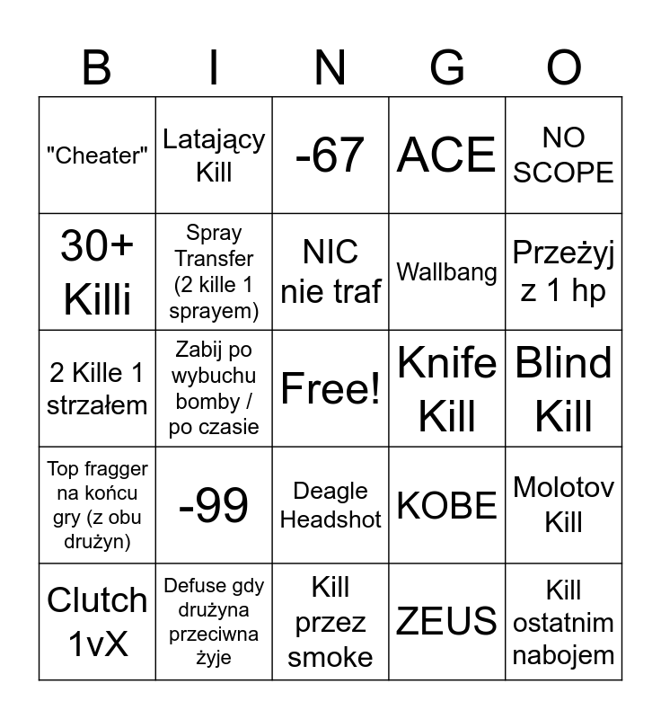 This bingo card has a free space and 24 words: -99, Defuse gdy drużyna przeciwna żyje, NIC nie traf, Clutch 1vX, NO SCOPE, "Cheater", 30+ Killi, Latający Kill, Knife Kill, Deagle Headshot, Wallbang, 2 Kille 1 strzałem, KOBE, Molotov Kill, Spray Transfer (2 kille 1 sprayem), ZEUS, Blind Kill, -67, Przeżyj z 1 hp, Zabij po wybuchu bomby / po czasie, Kill ostatnim nabojem, Top fragger na końcu gry (z obu drużyn), ACE and Kill przez smoke.