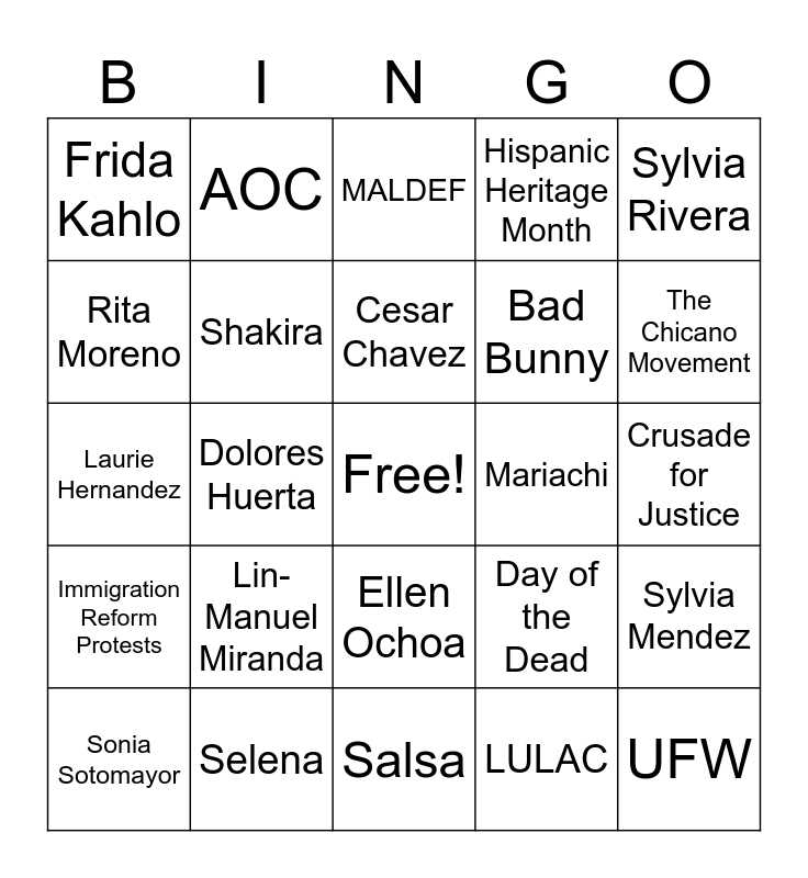 This bingo card has a free space and 24 words: Lin-Manuel Miranda, Selena, Cesar Chavez, Sonia Sotomayor, Sylvia Rivera, Frida Kahlo, Rita Moreno, AOC, Mariachi, Ellen Ochoa, Bad Bunny, Laurie Hernandez, Day of the Dead, Sylvia Mendez, Shakira, LULAC, Crusade for Justice, MALDEF, The Chicano Movement, Dolores Huerta, UFW, Immigration Reform Protests, Hispanic Heritage Month and Salsa.