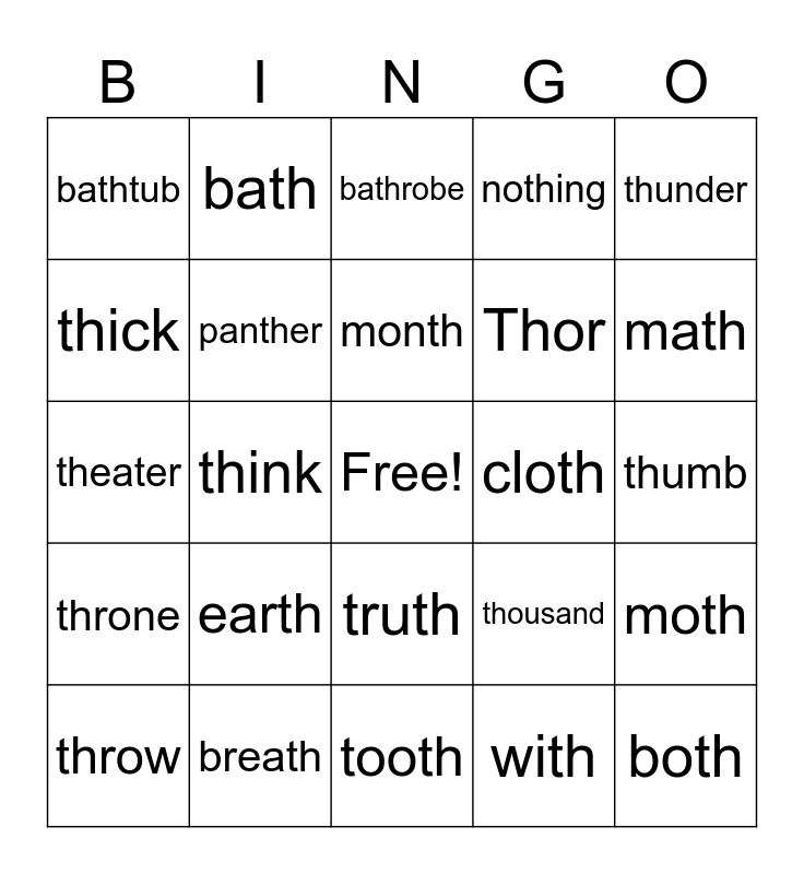 This bingo card has a free space and 29 words: throw, three, think, third, bathtub, bathrobe, panther, earth, cloth, breath, thumb, both, tooth, with, math, both, truth, throne, thunder, theater, thousand, thrift, Thor, thick, nothing, bath, moth, month and thanksgiving.