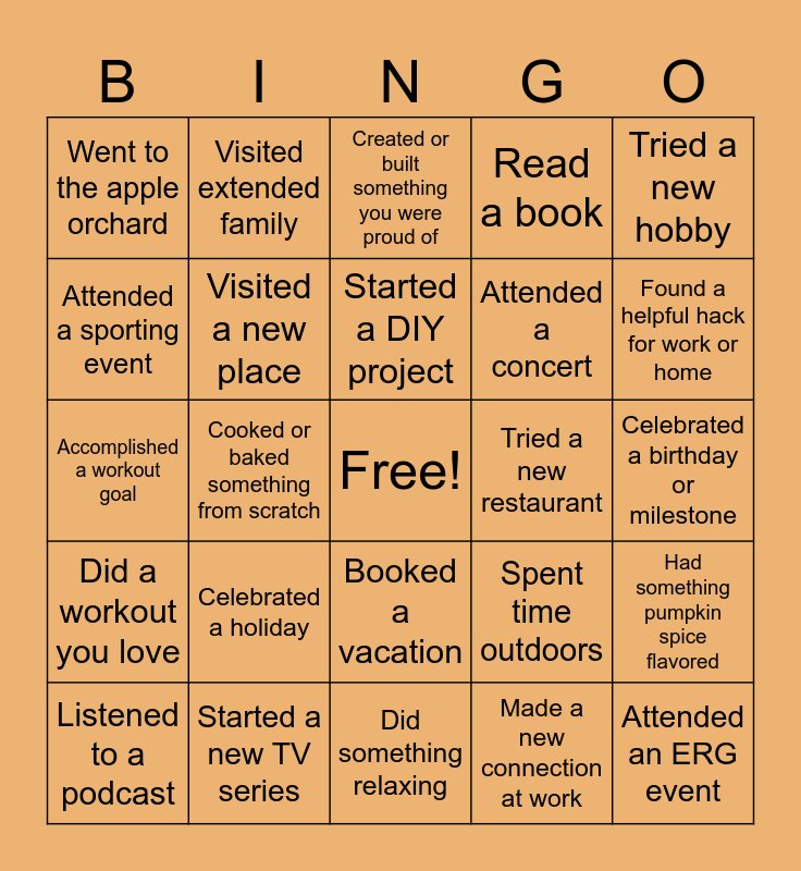 This bingo card has a free space and 24 words: Celebrated a holiday, Started a new TV series, Started a DIY project, Listened to a podcast, Tried a new hobby, Went to the apple orchard, Attended a sporting event, Visited extended family, Tried a new restaurant, Booked a vacation, Attended a concert, Accomplished a workout goal, Spent time outdoors, Had something pumpkin spice flavored, Visited a new place, Made a new connection at work, Celebrated a birthday or milestone, Created or built something you were proud of, Found a helpful hack for work or home, Cooked or baked something from scratch, Attended an ERG event, Did a workout you love, Read a book and Did something relaxing.