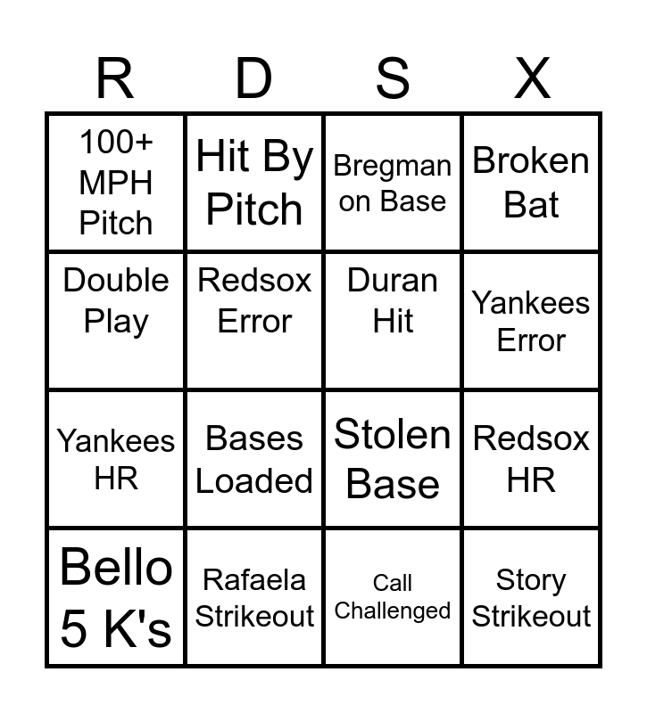 This bingo card has 16 words: Rafaela Strikeout, Redsox HR, Bregman on Base, 100+ MPH Pitch, Yankees HR, Hit By Pitch, Stolen Base, Call Challenged, Double Play, Redsox Error, Bello 5 K's, Broken Bat, Bases Loaded, Yankees Error, Duran Hit and Story Strikeout.