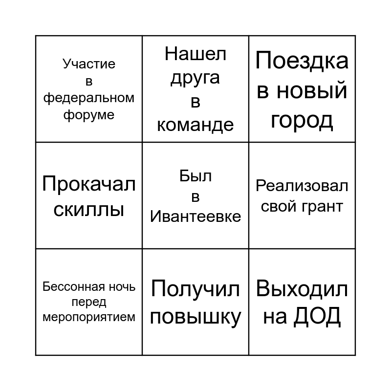 This bingo card has 9 words: Бессонная ночь перед меропориятием, Поездка в новый город, Нашел друга в команде, Прокачал скиллы, Участие в федеральном форуме, Реализовал свой грант, Был в Ивантеевке, Выходил на ДОД and Получил повышку.