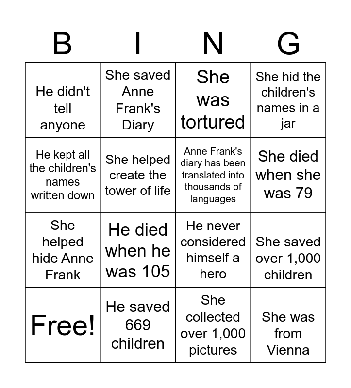This bingo card has 16 words: He saved 669 children, She saved over 1,000 children, She was tortured, He didn't tell anyone, She helped hide Anne Frank, She saved Anne Frank's Diary, He never considered himself a hero, She collected over 1,000 pictures, He kept all the children's names written down, She helped create the tower of life, Free!, She hid the children's names in a jar, He died when he was 105, She died when she was 79, Anne Frank's diary has been translated into thousands of languages and She was from Vienna.