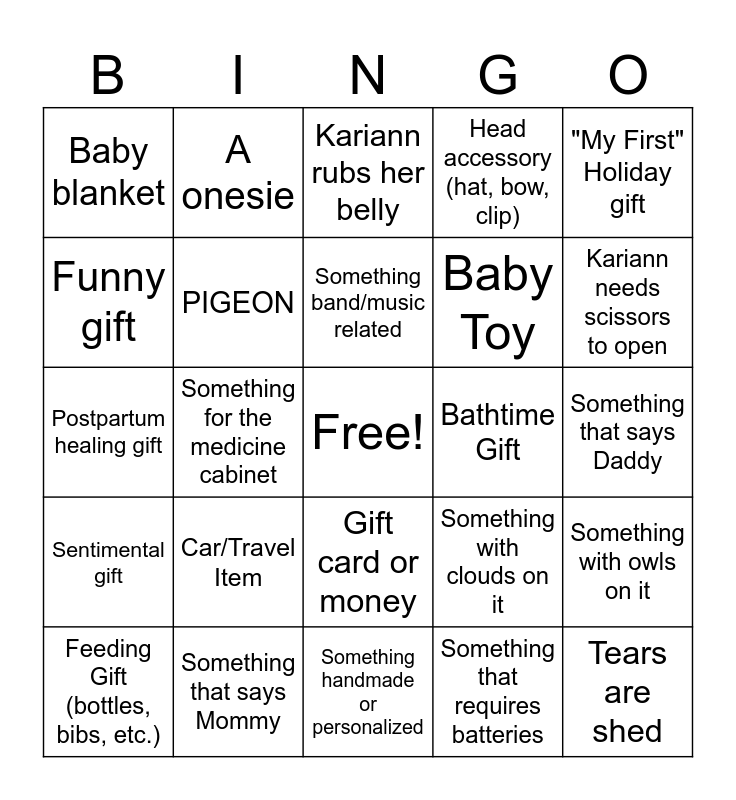 This bingo card has a free space and 29 words: Feeding Gift (bottles, bibs, etc.), A Packers Gift (Go Pack Go!), Something for the medicine cabinet, Something with cats on it, Baby blanket, Kariann rubs her belly, PIGEON, Car/Travel Item, Bathtime Gift, Something that says Mommy, Something that says Daddy, Tears are shed, Something handmade or personalized, Something that requires batteries, Kariann needs scissors to open, Your gift is opened, Gift card or money, Sentimental gift, "My First" Holiday gift, Postpartum healing gift, Something with clouds on it, An explanation for the gift is given, Baby Toy, Funny gift, Head accessory (hat, bow, clip), A onesie, Something with owls on it, Something band/music related and Something blue.
