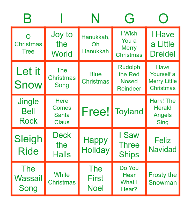 This bingo card has a free space and 42 words: Holly Jolly Christmas, Blue Christmas, Carol of the Bells, Deck the Halls, Do You Hear What I Hear?, Feliz Navidad, Frosty the Snowman, Good King Wenceslas, Hanukkah, Oh Hanukkah, Happy Holiday, Hark! The Herald Angels Sing, Have Yourself a Merry Little Christmas, Here Comes Santa Claus, I Have a Little Dreidel, I Saw Mommy Kissing Santa Claus, I Saw Three Ships, Its Beginning to Look a Lot Like Christmas, Jingle Bell Rock, Jingle Bells, Joy to the World, Let it Snow, Little Saint Nick, My Favorite Things, O Christmas Tree, O Holy Night, Rockin' Round the Christmas Tree, Rudolph the Red Nosed Reindeer, Run Rudolph Run, Santa Baby, Silent Night, Silver Bells, Sleigh Ride, The Christmas Song, The First Noel, The Holly and the Ivy, The Wassail Song, White Christmas, Toyland, Winter Wonderland, You're a Mean One, Mr. Grinch, I Wish You a Merry Christmas and The Little Drummer Boy.